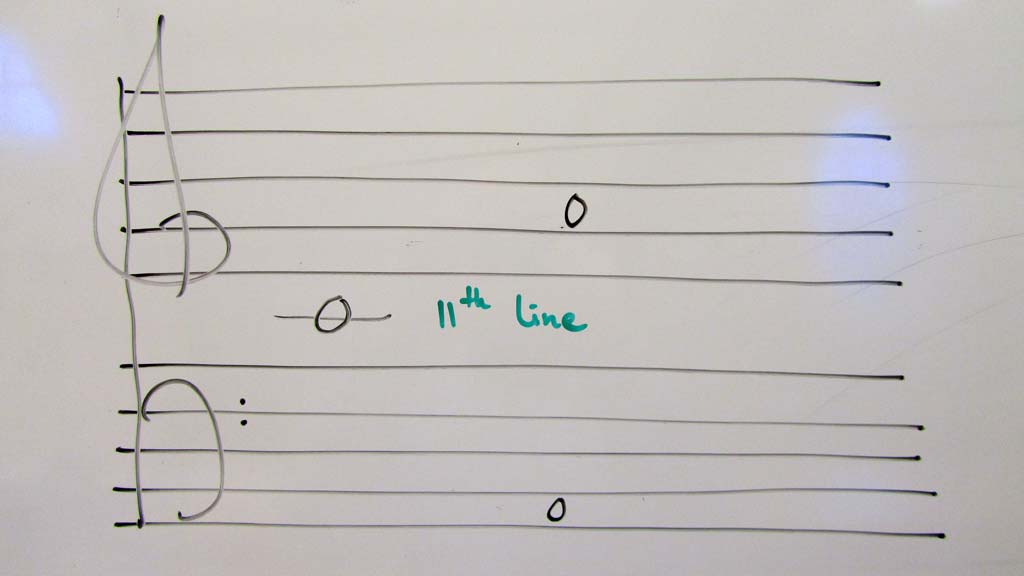 IMG_0530 Published January 12, 2013 at 1024 × 576 in Whiteboards January 2013 11th line in piano notation read the full text... an 11th line can be imagined to connect the staff system of piano notation
