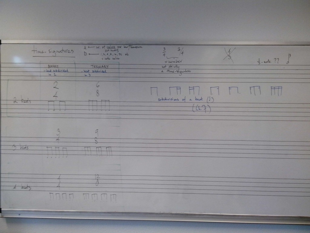 IMG_20130917_104832 Published September 21, 2013 at 4319 × 3241 in Whiteboards September 2013 beaming, time signatures, subdivisions of the beat read the full text... beaming, time signatures, subdivisions of the beat